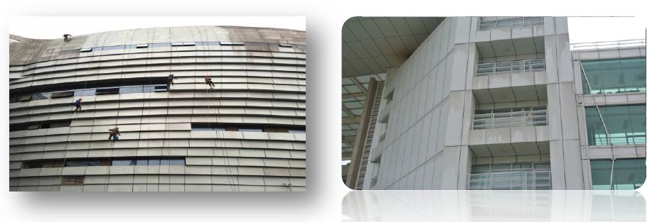 外墙虽美,但经过城市尾气、尘灰、油垢、污垢等日积月累的侵蚀也会给美丽的外衣蒙上一层阴影。外墙的污垢成分比较复杂,这给清洗带来一定的难度,好的清洗剂应该满足既能把污垢清洗干净,同时又不会对外墙造成损伤。目前市场上常用的清洁剂包括二种: